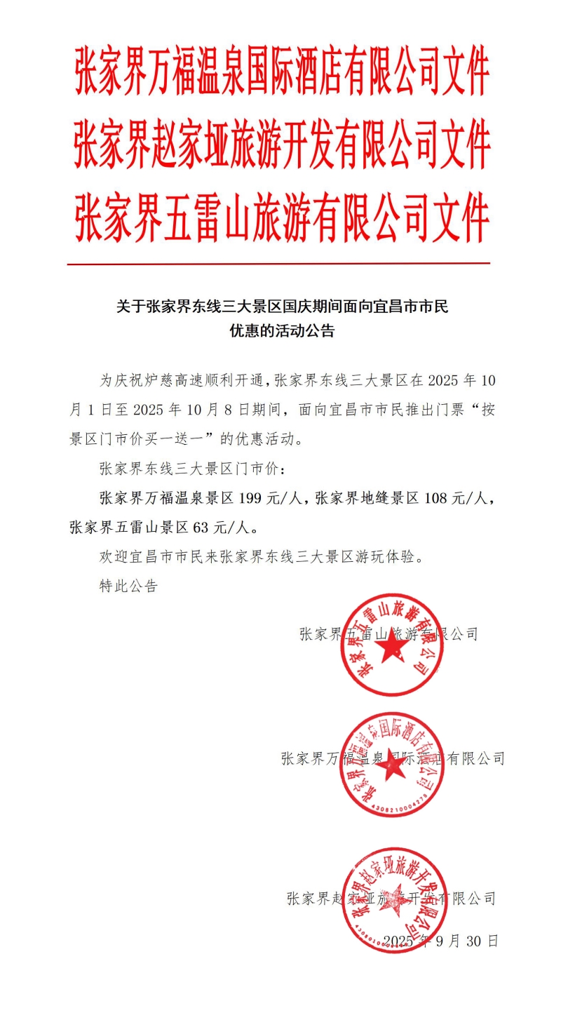 關(guān)于張家界東線三大景區(qū)國(guó)慶期間面向宜昌市市民優(yōu)惠的活動(dòng)公告